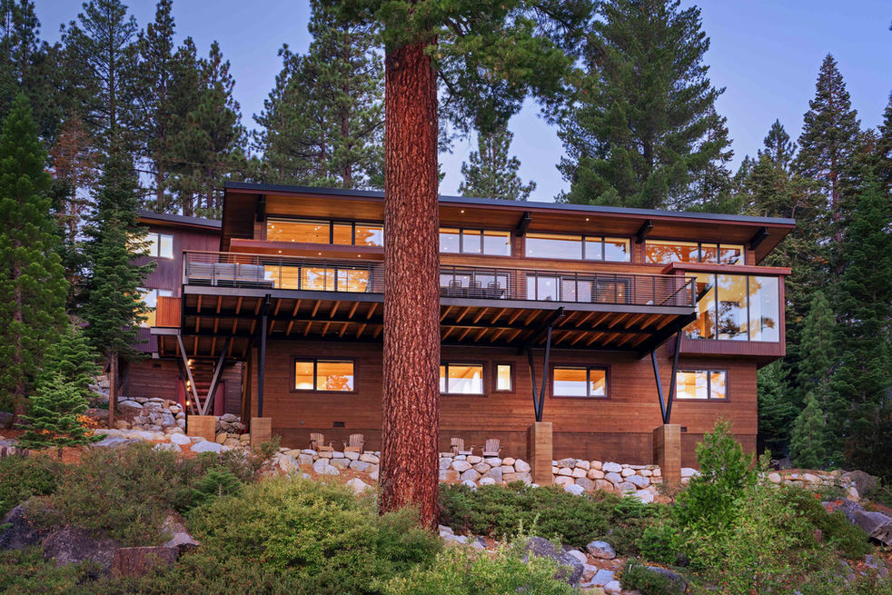 The client's primary goal for this beautiful lot near Emerald Bay was to create a simple home that complimented without overshadowing the main attraction: Lake Tahoe. The home’s upper floor living area is a single open space, with a chef’s kitchen at one end and a living room with wrap-around glass windows at the other. Special attention was paid to the corners of this space. In the kitchen, two sliding windows create a large pass-through, allowing for seamless indoor-outdoor cooking on the lakeview deck. And in the living room, a pop-out volume with floor-to-ceiling windows creates the illusion of being suspended over the lake just below.